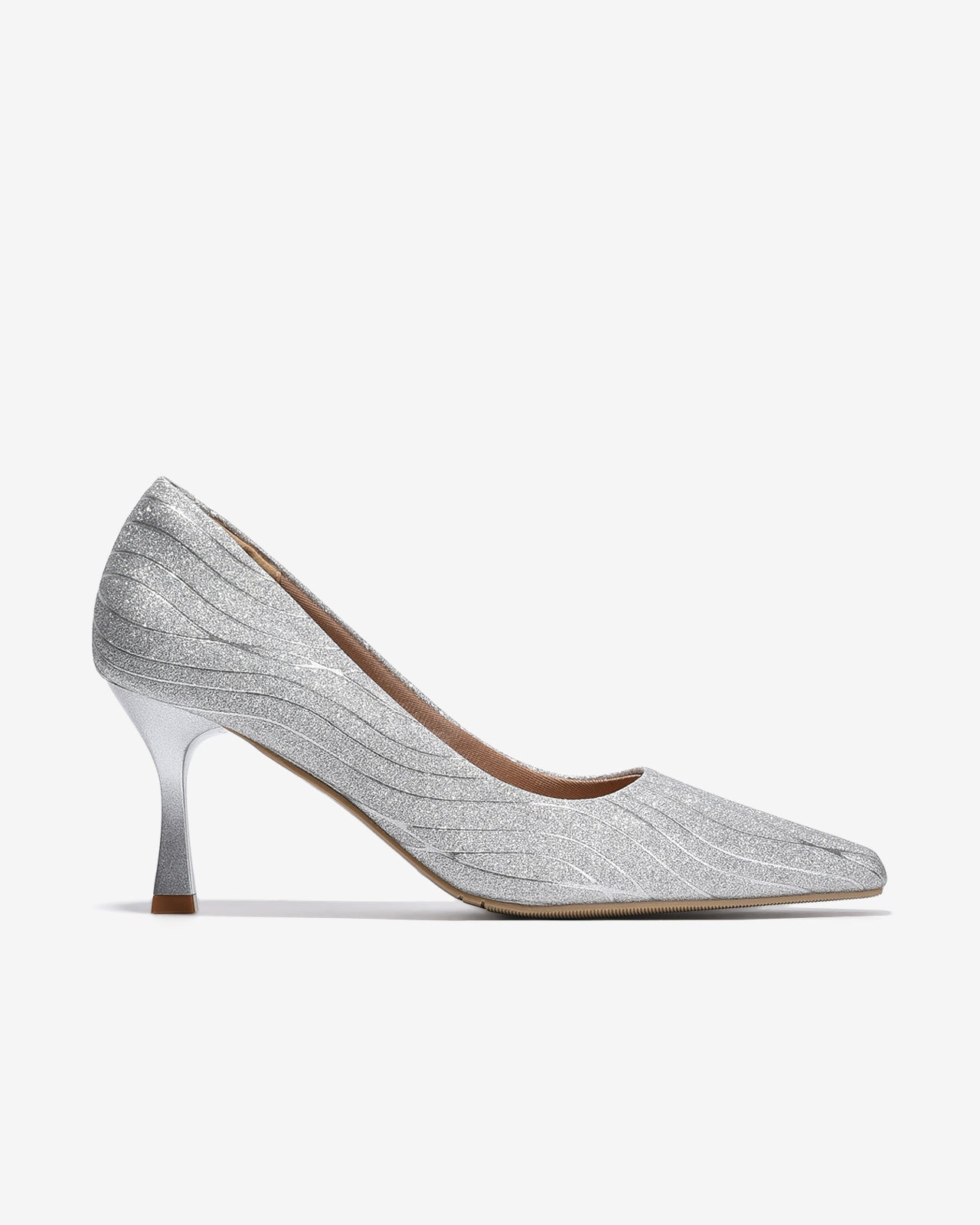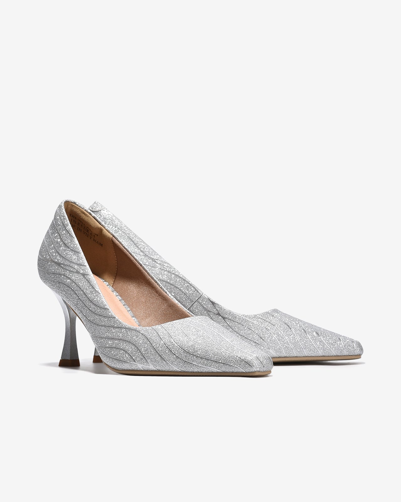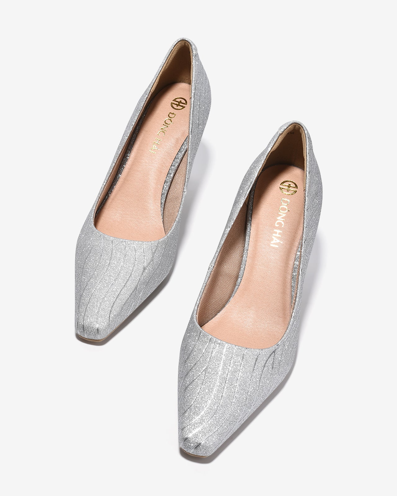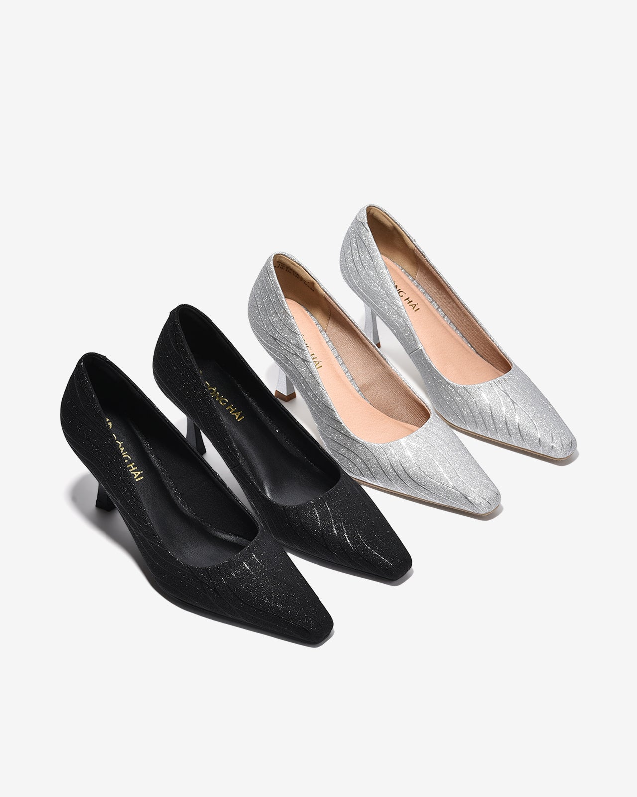 Giày Cao Gót Nữ Đông Hải nổi bật với bề mặt ánh kim lấp lánh, tạo hiệu ứng sang trọng và thu hút ánh nhìn. Họa tiết gợn sóng mềm mại ôm theo phom giày giúp đôi chân thêm thon gọn. Mũi nhọn thanh mảnh kết hợp gót cao thon nhẹ tôn dáng nhưng vẫn chắc chắn khi di chuyển. Điểm nhấn logo mạ vàng bên hông giày tăng thêm nét tinh tế. Chất liệu mềm mại, êm chân, lý tưởng cho tiệc tối và các sự kiện đặc biệt.